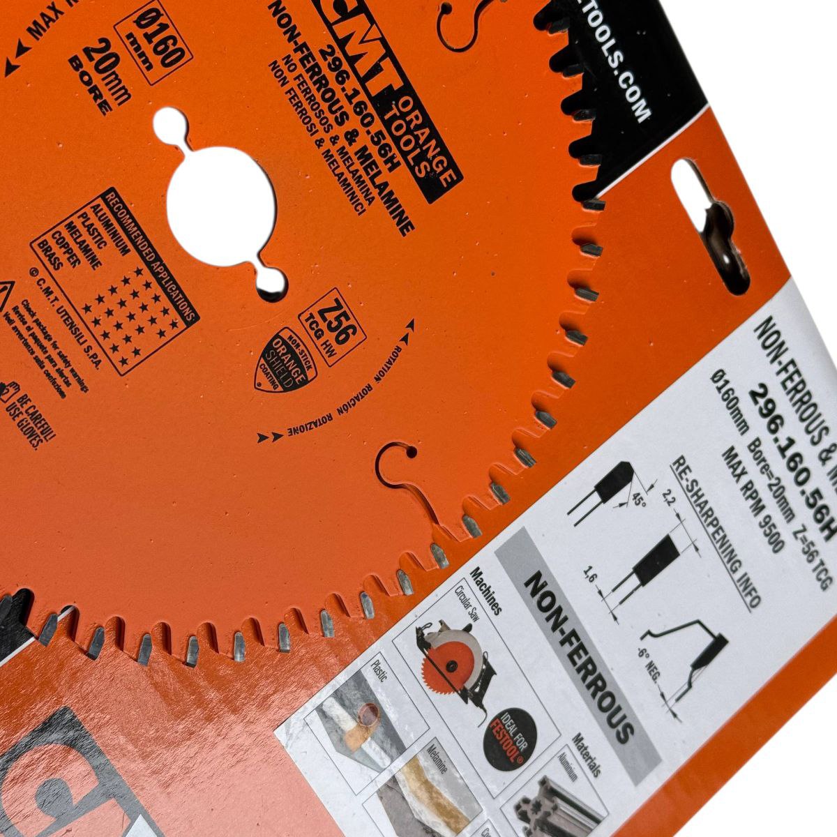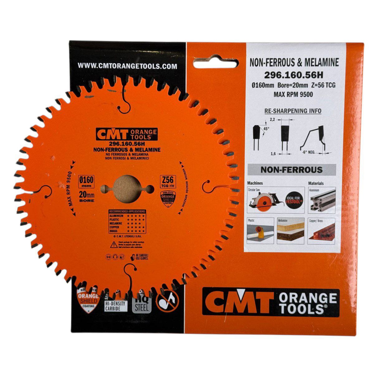CMT 296.160.56H — пильный диск диаметром 160 мм с 56 зубцами, предназначенный для чистой резки алюминия, латуни, ламинированных плит, ДСП, МДФ, фанеры и других древесных материалов. Благодаря специальной геометрии зубцов, диск обеспечивает аккуратный рез без сколов, что особенно важно при работе с ламинированными поверхностями.