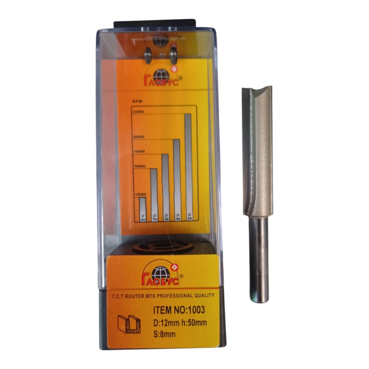 Фреза пазовая прямая 12мм с длиной режущей части 50мм 8 хвостовик серия фрезы 1003 Глобус. Высокая рабочая часть обеспечивает обработку 50мм за один раз.