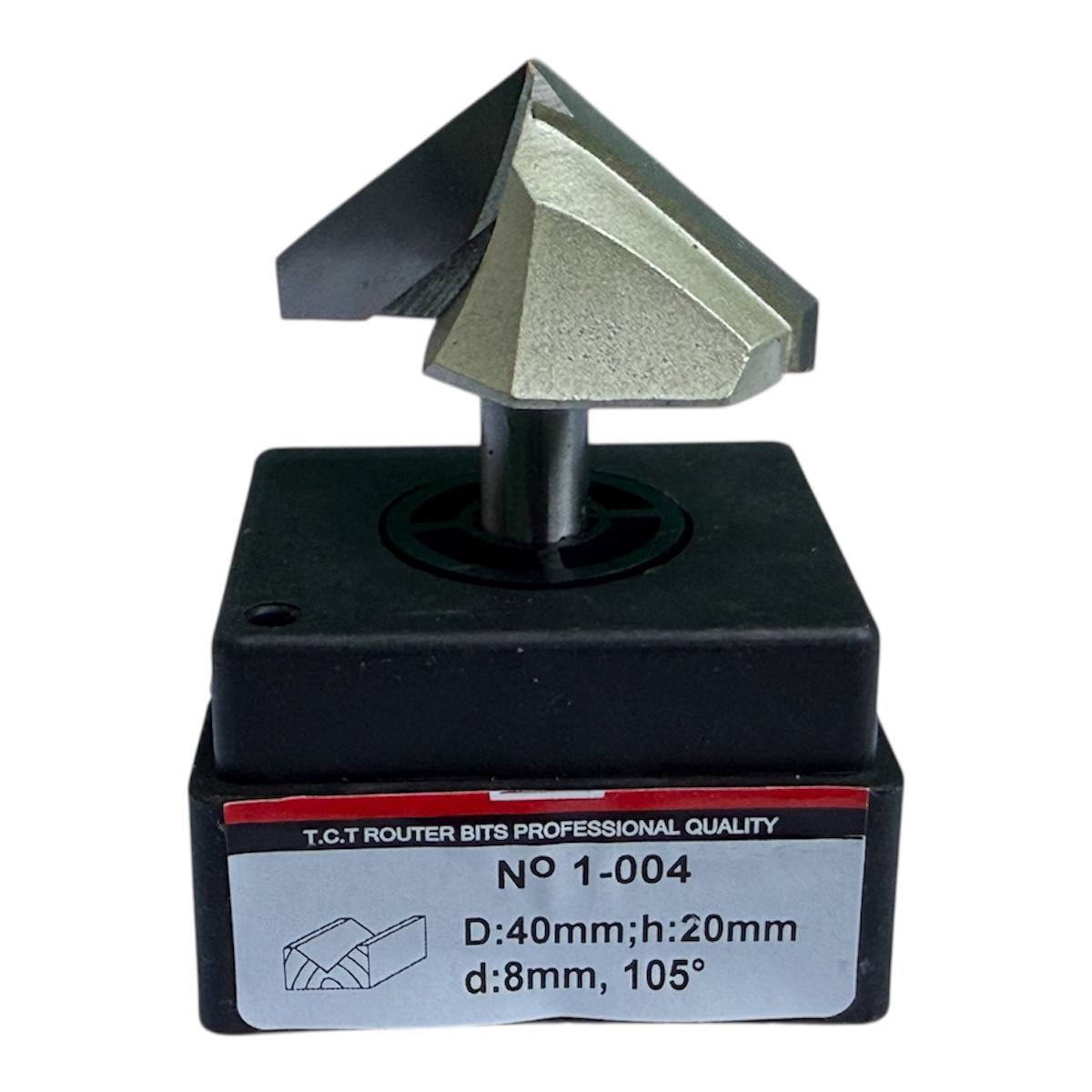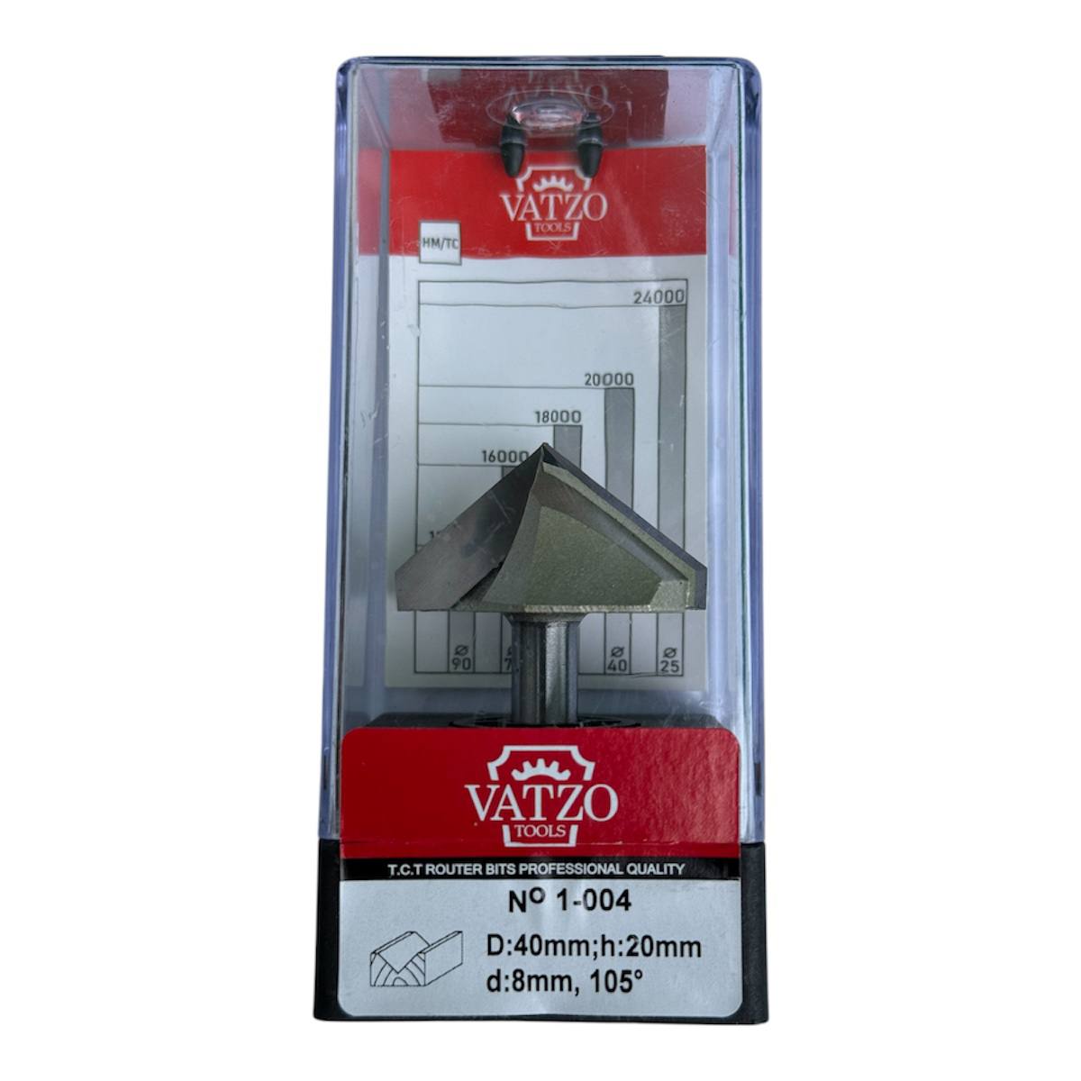 VATZO 1004 D40 d8 h20 TL60 – фреза V-образная 105° Ø40 мм с хвостовиком 8 мм. Предназначена для декоративных пазов и фасок в древесине и плитных материалах, что обеспечивает точность и чистый рез.