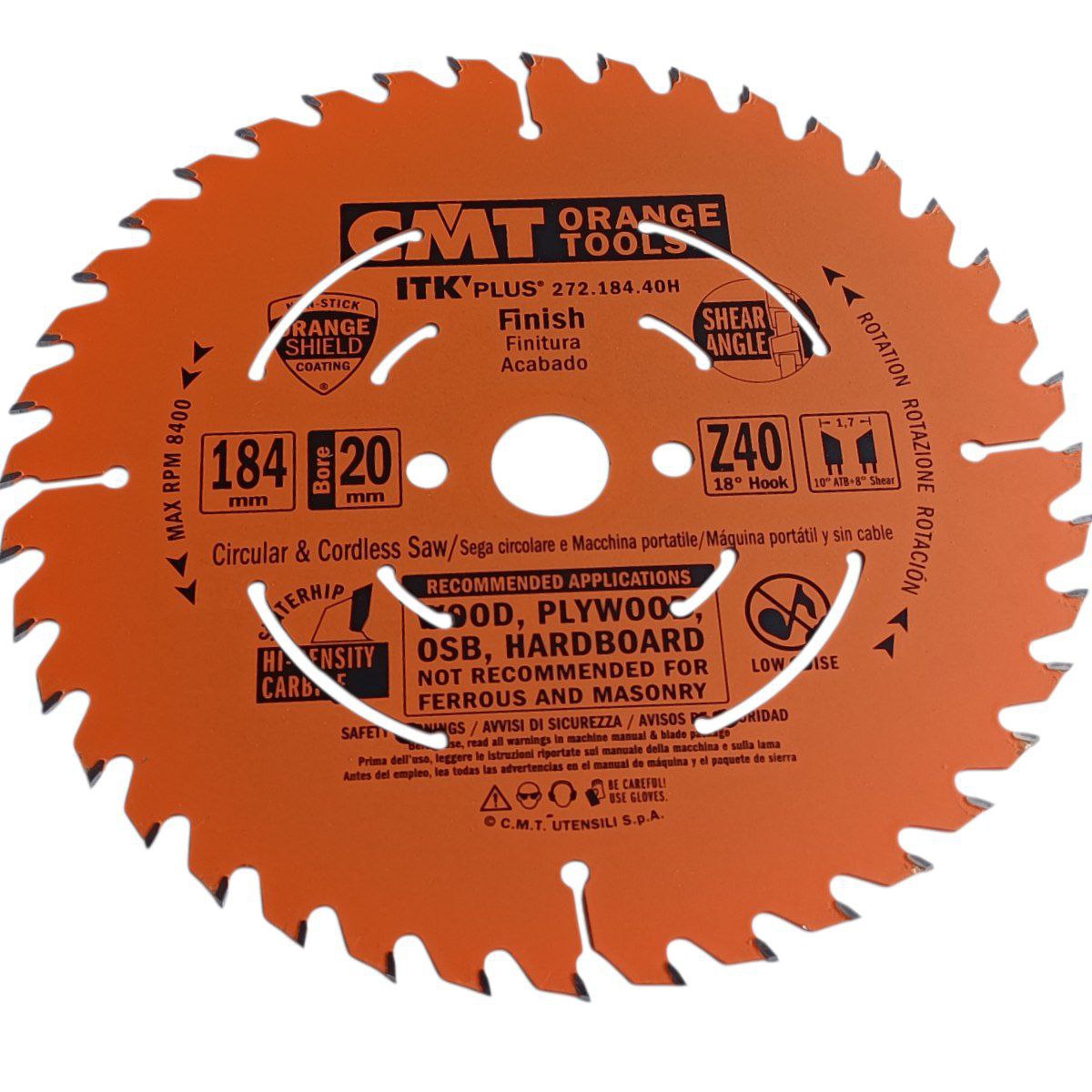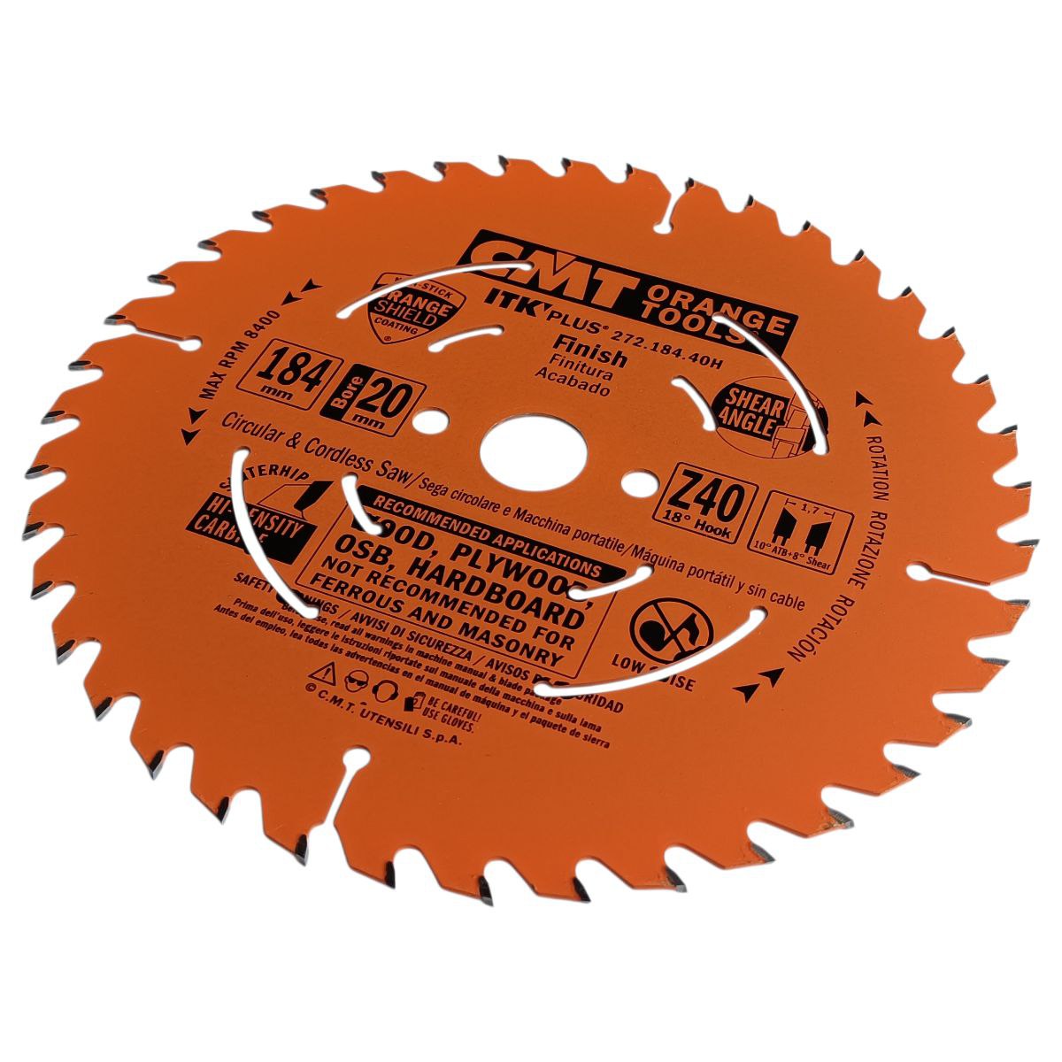 CMT 272.184.40H — пиляльний диск Ø184 мм, 20 мм посадка, 40 зубів, тонкий пропил 1,7 мм, для чистого різання деревини та плитних матеріалів.