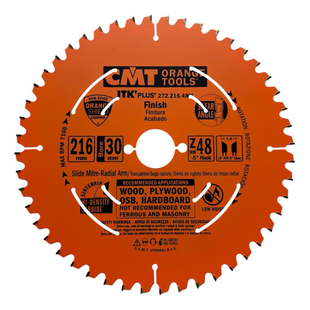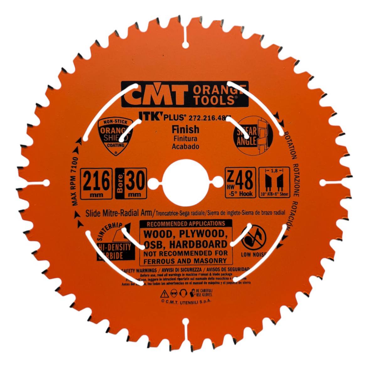 CMT 272.216.48M — пиляльний диск Ø216 мм, 30 мм посадка, 48 зубів, тонкий пропил 1,8 мм, товщина полотна 1,2 мм, для чистого різання деревини та плитних матеріалів. Серія дисків ITK PLUS тефлонове покриття.