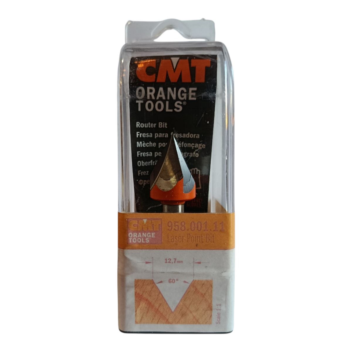 CMT 958.001.11 — Laser Point Bit (D12,7 мм, h11 мм, L57,2 мм, хвостовик 8 мм, кут 60°). Використовується для гравіювання, вибірки V‑подібних пазів та декоративного оздоблення деревини й плитних матеріалів. Забезпечує надзвичайно чистий і точний різ, оптимальна для меблевого та столярного виробництва.
