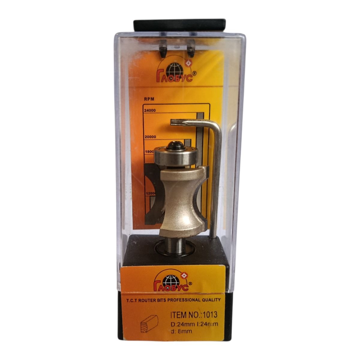 ГЛОБУС 1013 — кромочна напівстержнева фреза (R10 мм, D24 мм, h24 мм, хвостовик 8 мм), призначена для декоративного профілювання кромок деревини та плитних матеріалів. Оснащена твердосплавними ріжучими пластинами, забезпечує чистий і точний різ, ідеально підходить для столярних та меблевих робіт.
