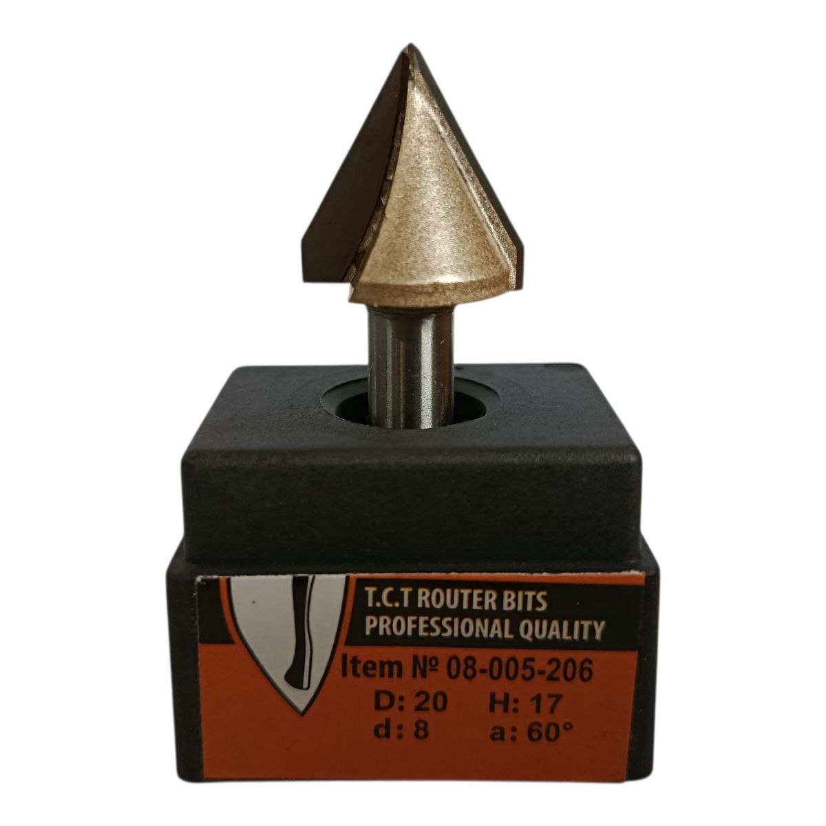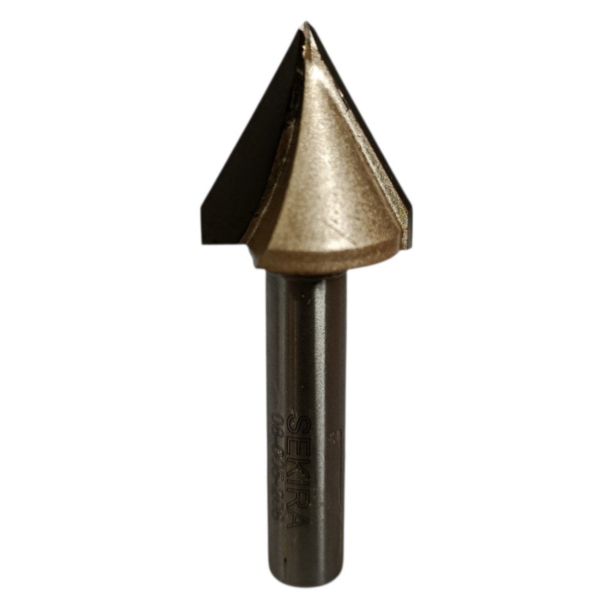 SEKIRA 08-005-206 (1004) — V‑подібна кінцева фреза (D20 мм, 60°, h17 мм, хвостовик 8 мм), призначена для вибірки v пазів, каннелюр та декоративних елементів у деревині та плитних матеріалах. Оснащена твердосплавними ріжучими пластинами, забезпечує чистий і точний різ, ідеально підходить для столярних та меблевих робіт