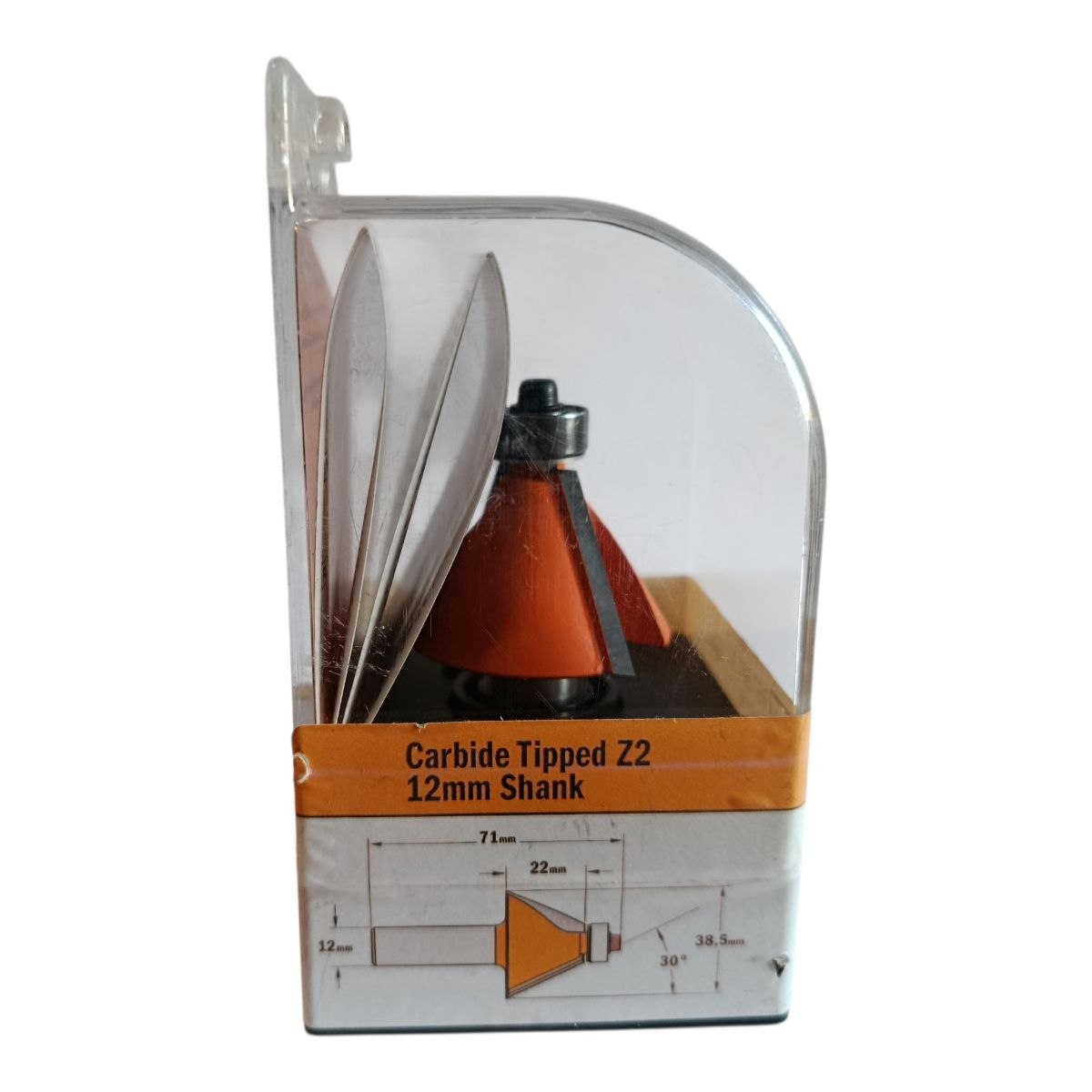 CMT 957.501.11 — фасонна фреза Chamfer Bit (D38,5 мм, h22 мм, L71 мм, хвостовик 12 мм, кут 30°). Призначена для зняття фаски та декоративної обробки країв деревини та плитних матеріалів. Забезпечує чистий і акуратний різ, ідеально підходить для меблевого та столярного виробництва.