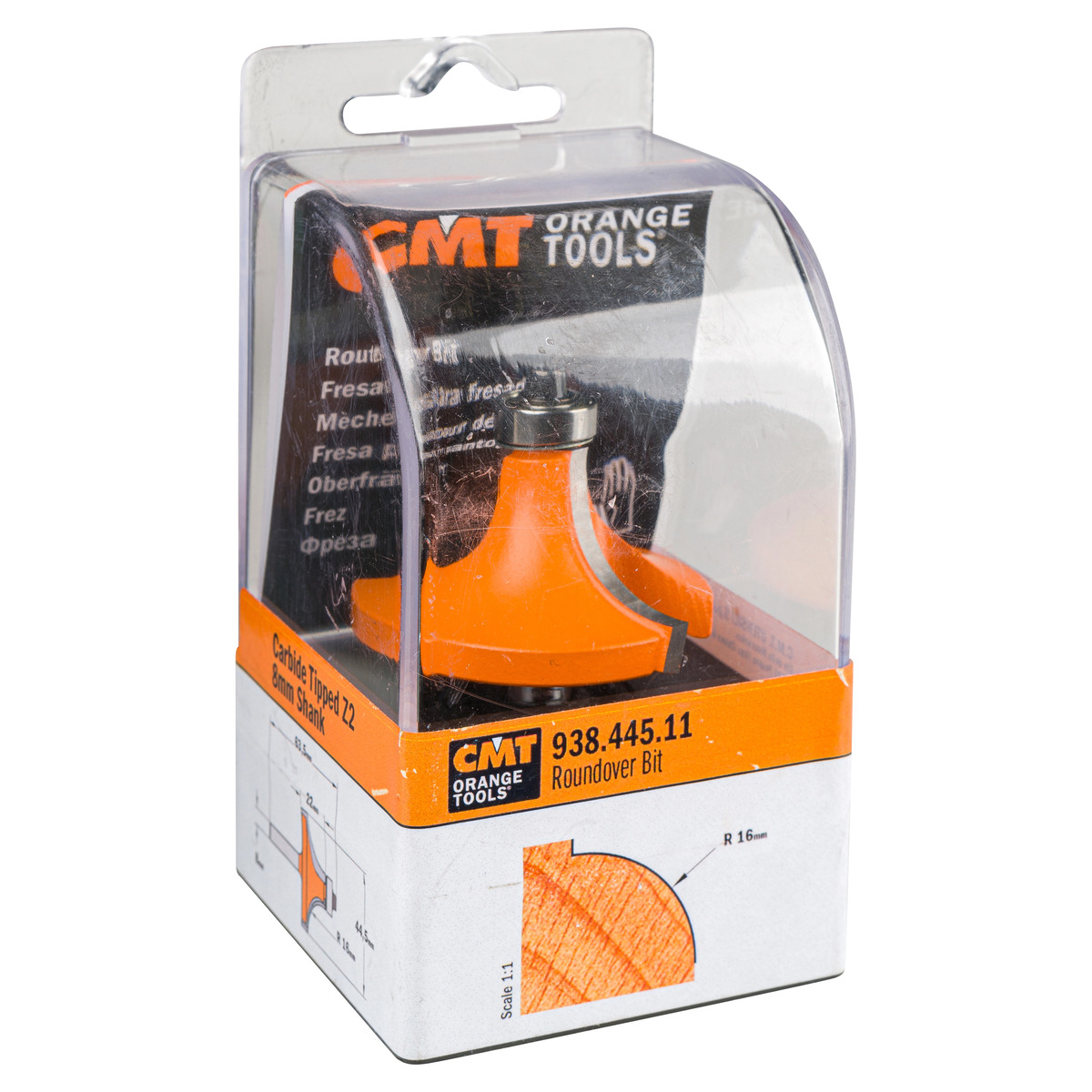 CMT 938.445.11 — це кромочна калевочна фреза з радіусом R16 мм, діаметром D44,5 мм та хвостовиком 8 мм. Вона призначена для декоративного профілювання та заокруглення кромок деревини, фанери, МДФ та ДСП, забезпечуючи чистий і точний різ.