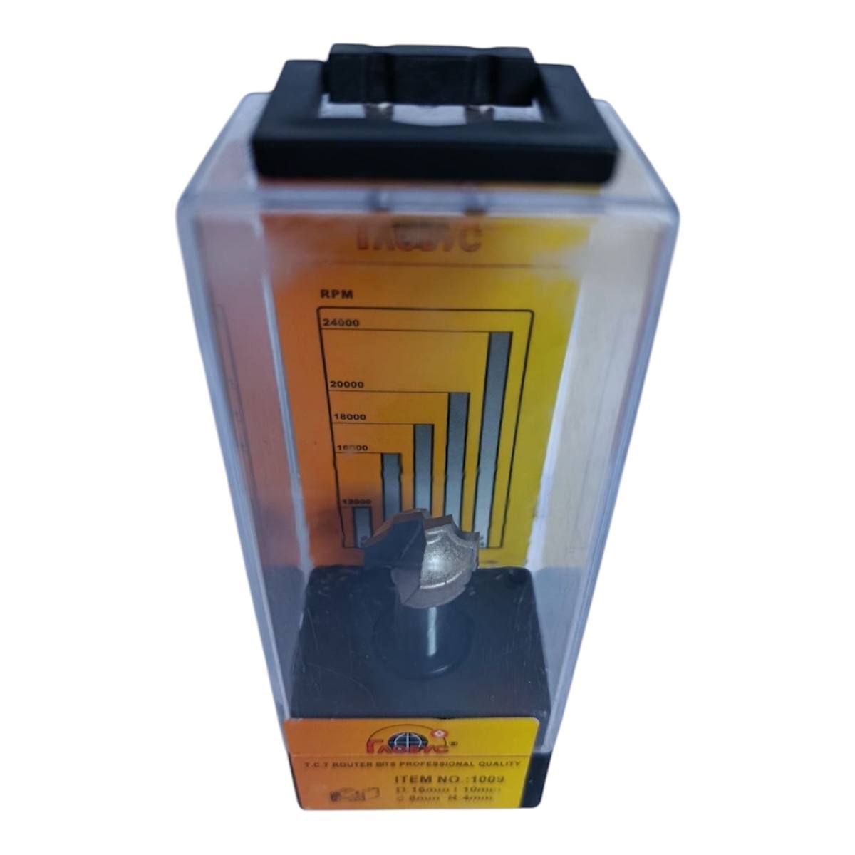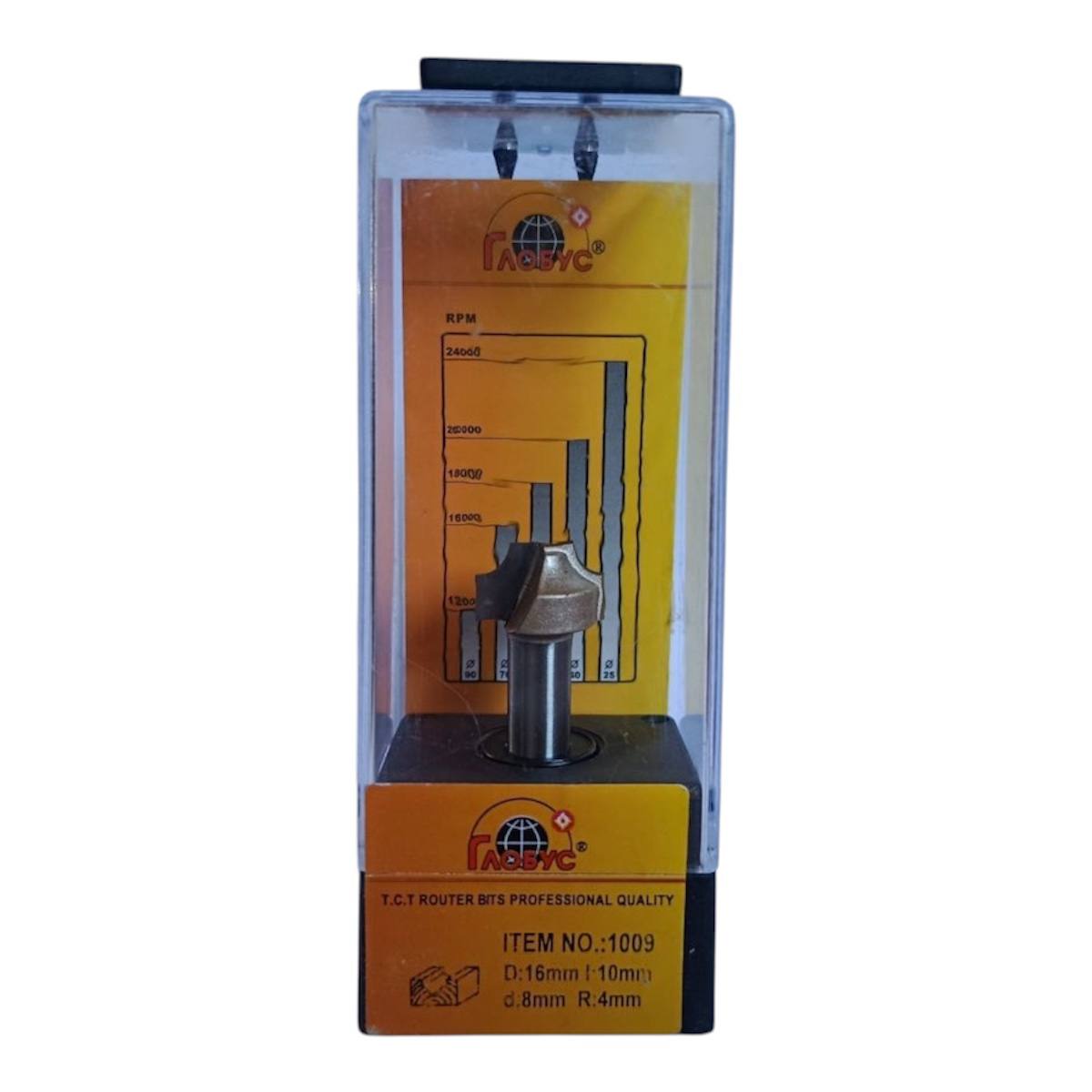 Фреза фасонна Globus 1009 — професійна фреза діаметром 16 мм для декоративної обробки деревини. Має робочу висоту 10 мм, радіус профілю R4, хвостовик 8 мм та загальну довжину 45 мм. Оснащена твердосплавними напайками для чистого різу та довгого терміну служби.