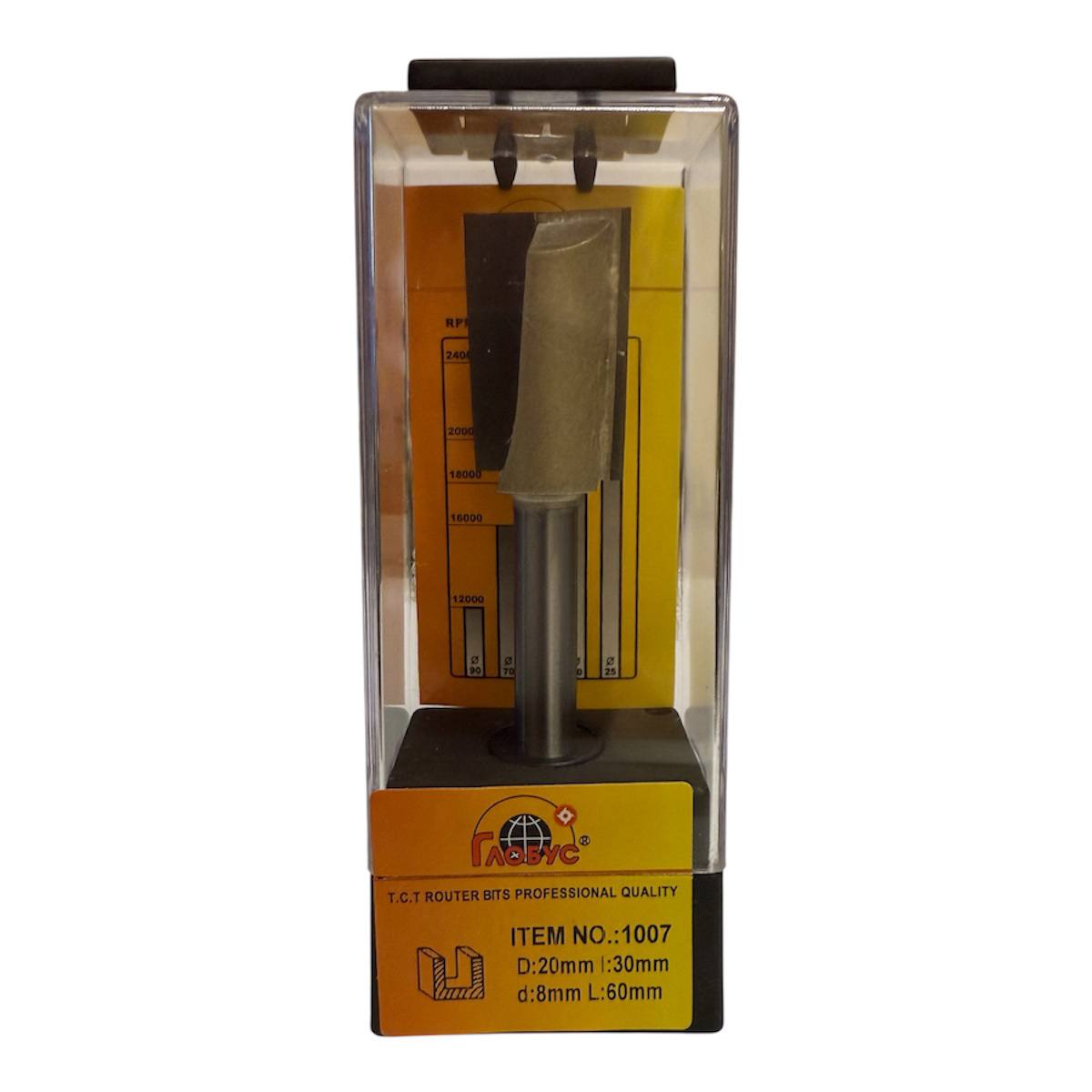 Фреза Глобус 1007 D20 мм з довжиною 90 мм — для точного фрезерування деревини, МДФ, фанери та інших плитних матеріалів. Завдяки довжині ріжучої частини 30 мм та загальній довжині 90 мм, вона ідеально підходить для глибоких пазів, засвердлювання та врізки фурнітури.