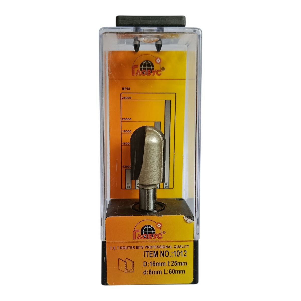 ГЛОБУС 1012 — півкругла галтельна фреза (D16 мм, h25 мм, L60 мм, хвостовик 8 мм), призначена для вибірки декоративних каннелюр та жолобків у деревині та плитних матеріалах. Оснащена твердосплавними ріжучими пластинами, забезпечує чистий і точний різ, ідеально підходить для столярних та меблевих робіт.