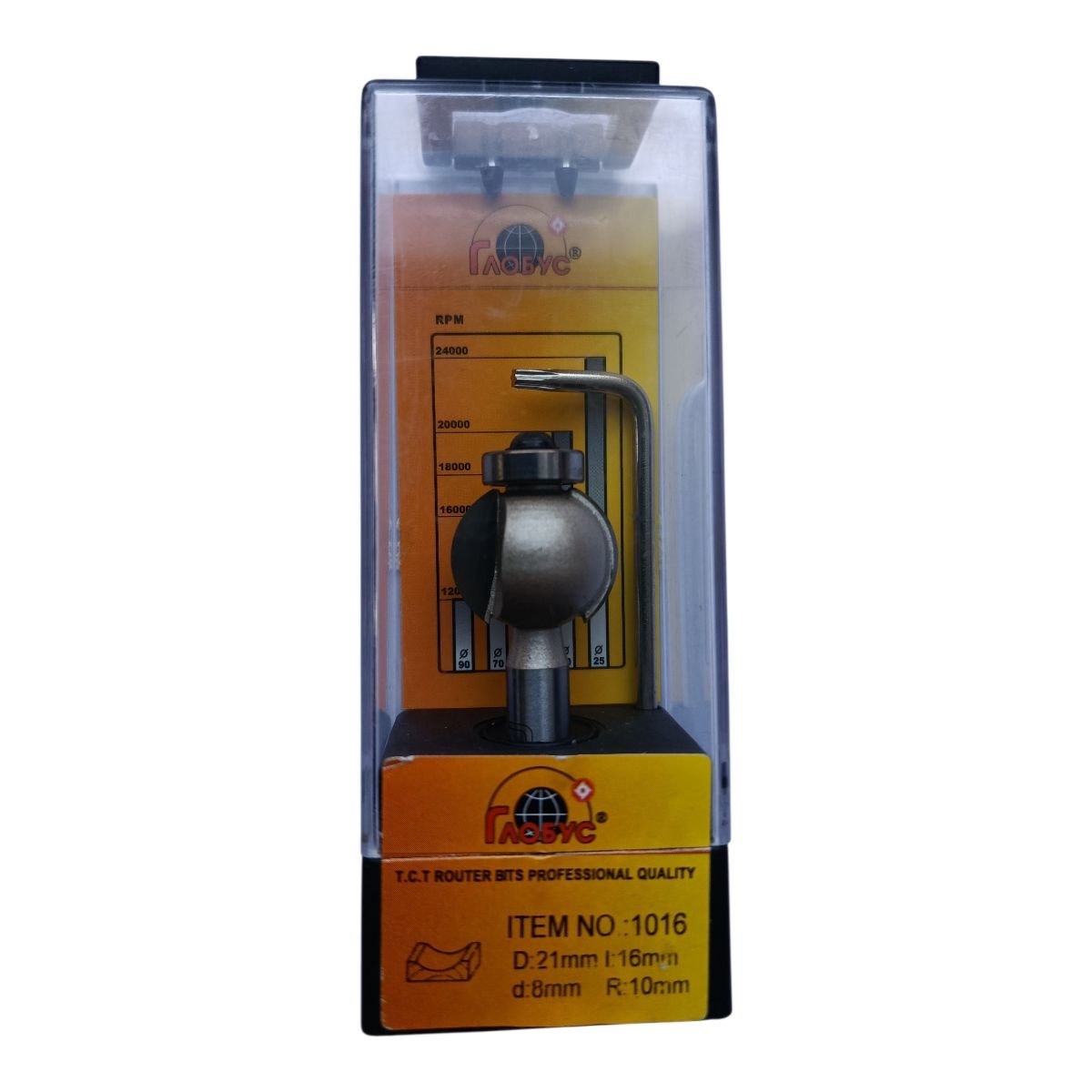 Глобус 1016 — кромкова галтельна фреза для дерева. Має діаметр 21 мм, робочу висоту 16 мм, хвостовик 8 мм та загальну довжину близько 64 мм. Призначена для формування декоративних крайок із плавним радіусом та вибірки гальтельних пазів.