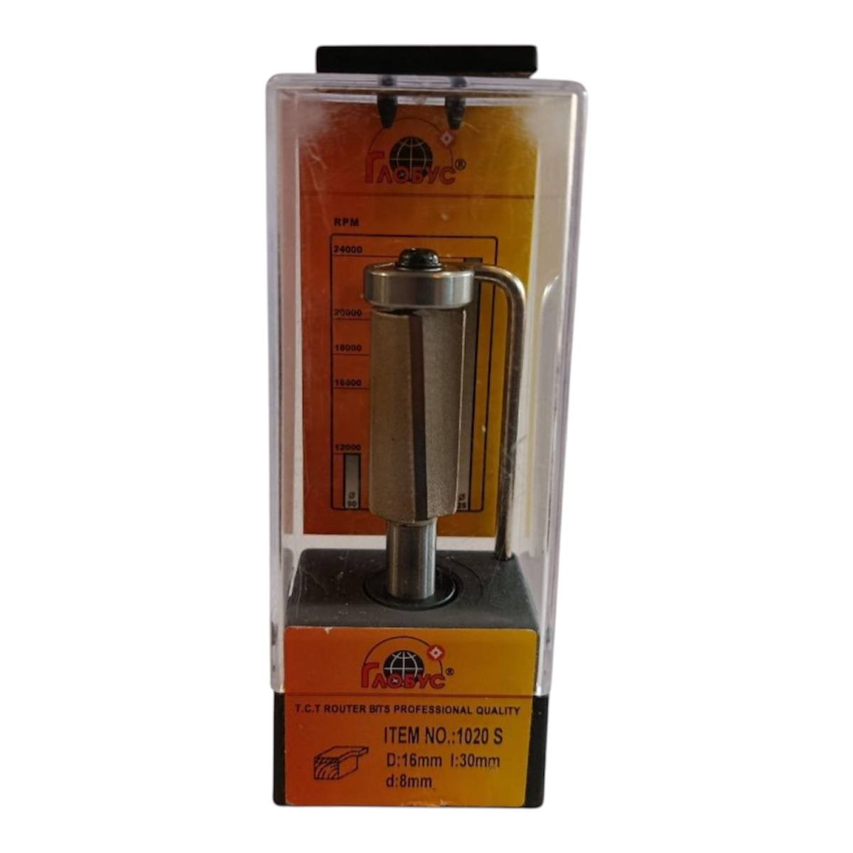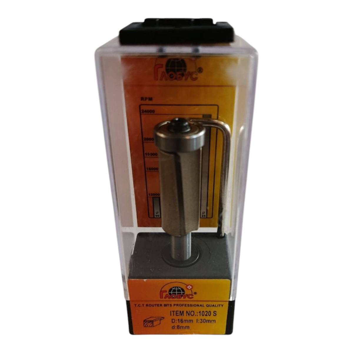 Глобус 1020 — пряма копіювальна фреза з косими ножами, діаметром 16 мм, робочою висотою 30 мм, хвостовиком 8 мм та загальною довжиною ~75 мм. Оснащена двома ріжучими кромками (Z2). Призначена для точного копіювання та вирівнювання крайки по шаблону або деталі, забезпечує чистий різ завдяки косому розташуванню ножів.