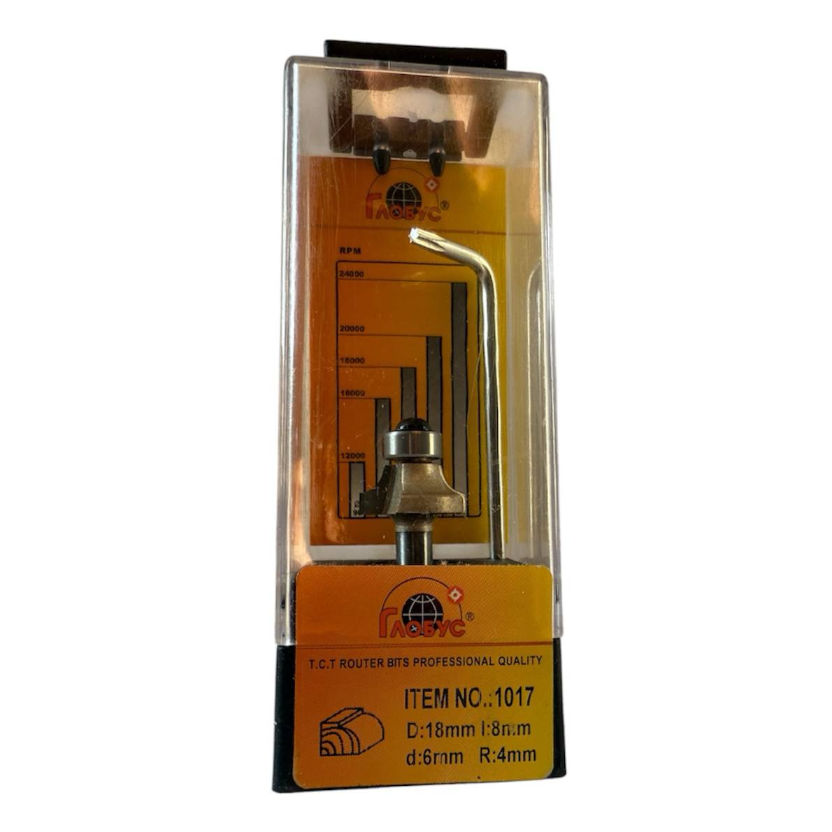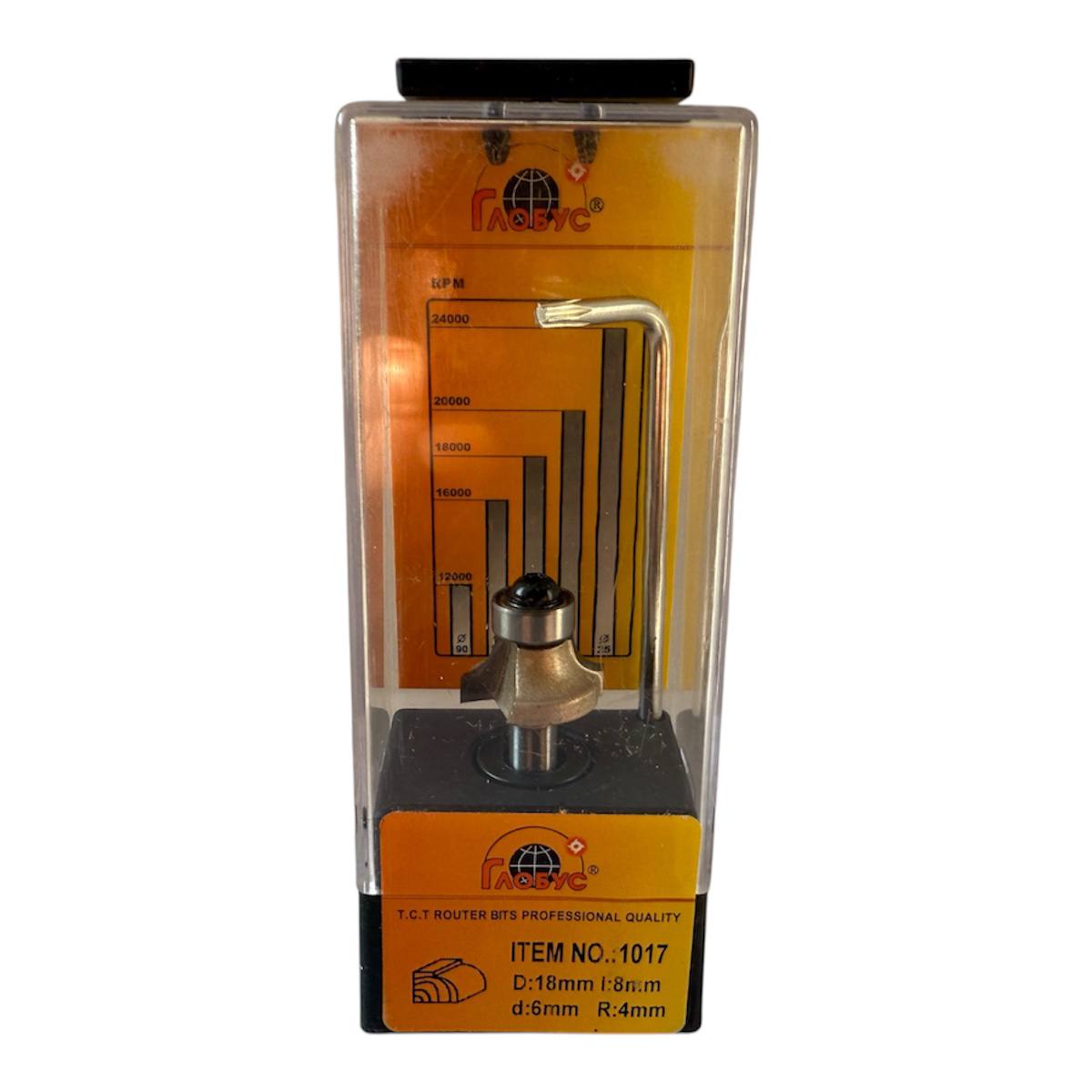 Фреза радіус 4 мм Глобус 1017 D18 h8 d6 R4 — інструмент для заокруглень і фасок. Забезпечує чисту обробку деревини та плитних матеріалів, сумісна з ручними фрезерами.