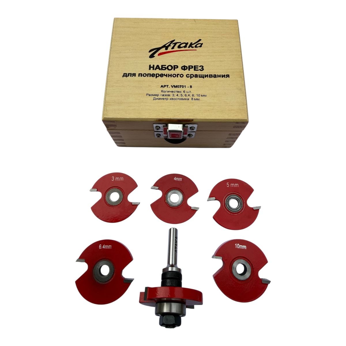 Набір фрез ATAKA VM0701-8 (6 шт.) — це професійний комплект пазових фрез для вибірки поперечних пазів у деревині. Завдяки різним висотам ріжучих частин набір дозволяє виконувати широкий спектр по висоті та конструкційних операцій у столярних і меблевих роботах.
