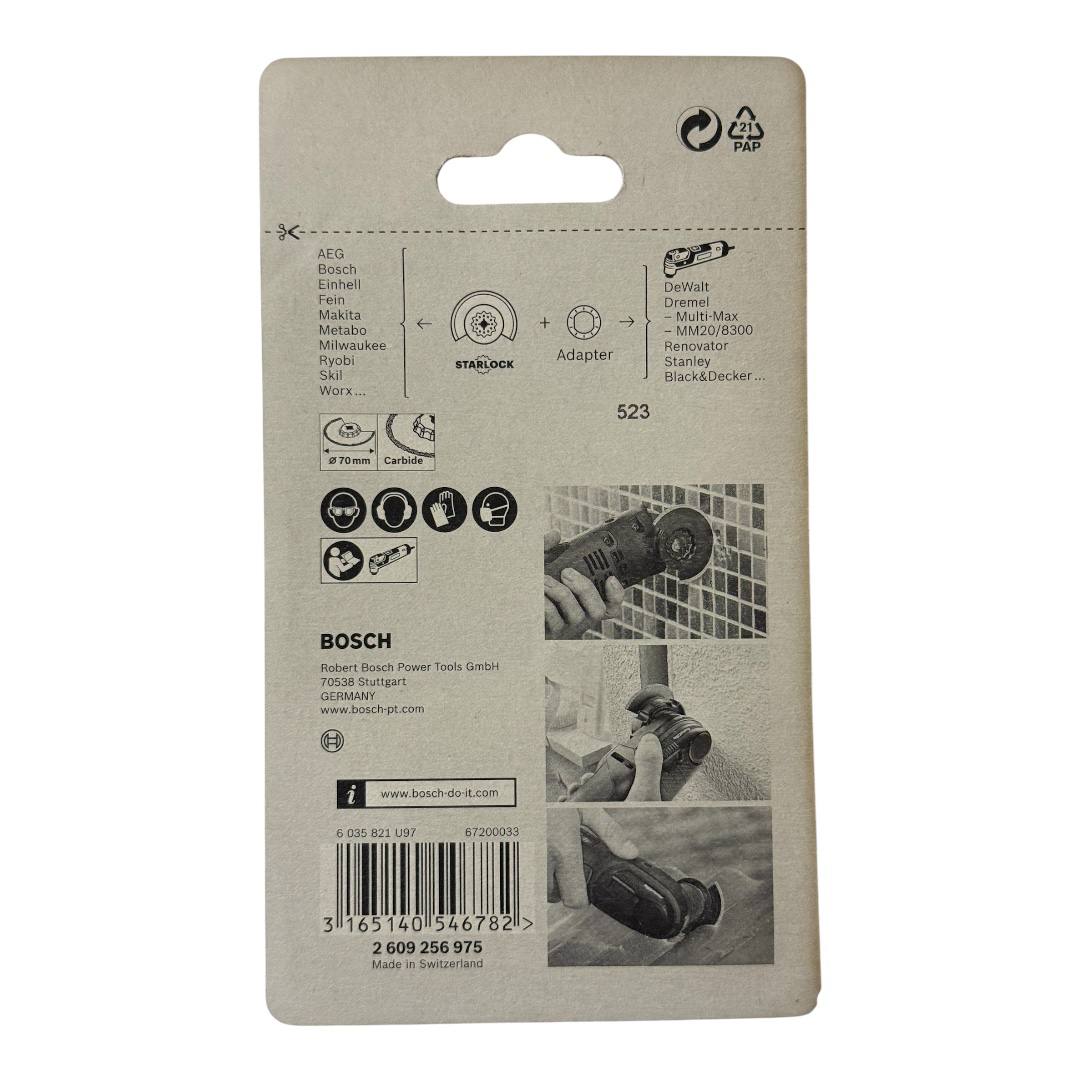 Насадка Bosch ACZ 70 RT5 Carbide (2609256975) зі стандартом Starlock — професійне сегментне пиляльне полотно для реноватора. Призначене для зачистки плиткових швів, видалення клею, розчину та роботи з плиткою, каменем, бетоном і гіпсокартоном. Завдяки карбідному покриттю забезпечує довгий термін служби та ефективність у ремонтних і демонтажних роботах.